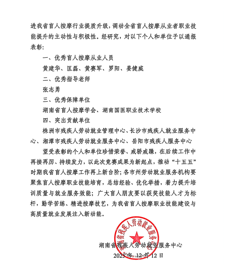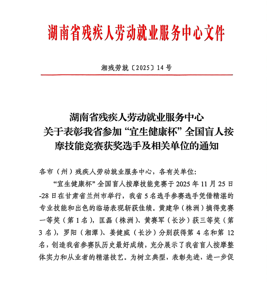 湖南省残疾人劳动就业服务中心关于表彰我省参加“宜生健康杯”全国盲人按摩技能竞赛获奖选手及相关单位的通知