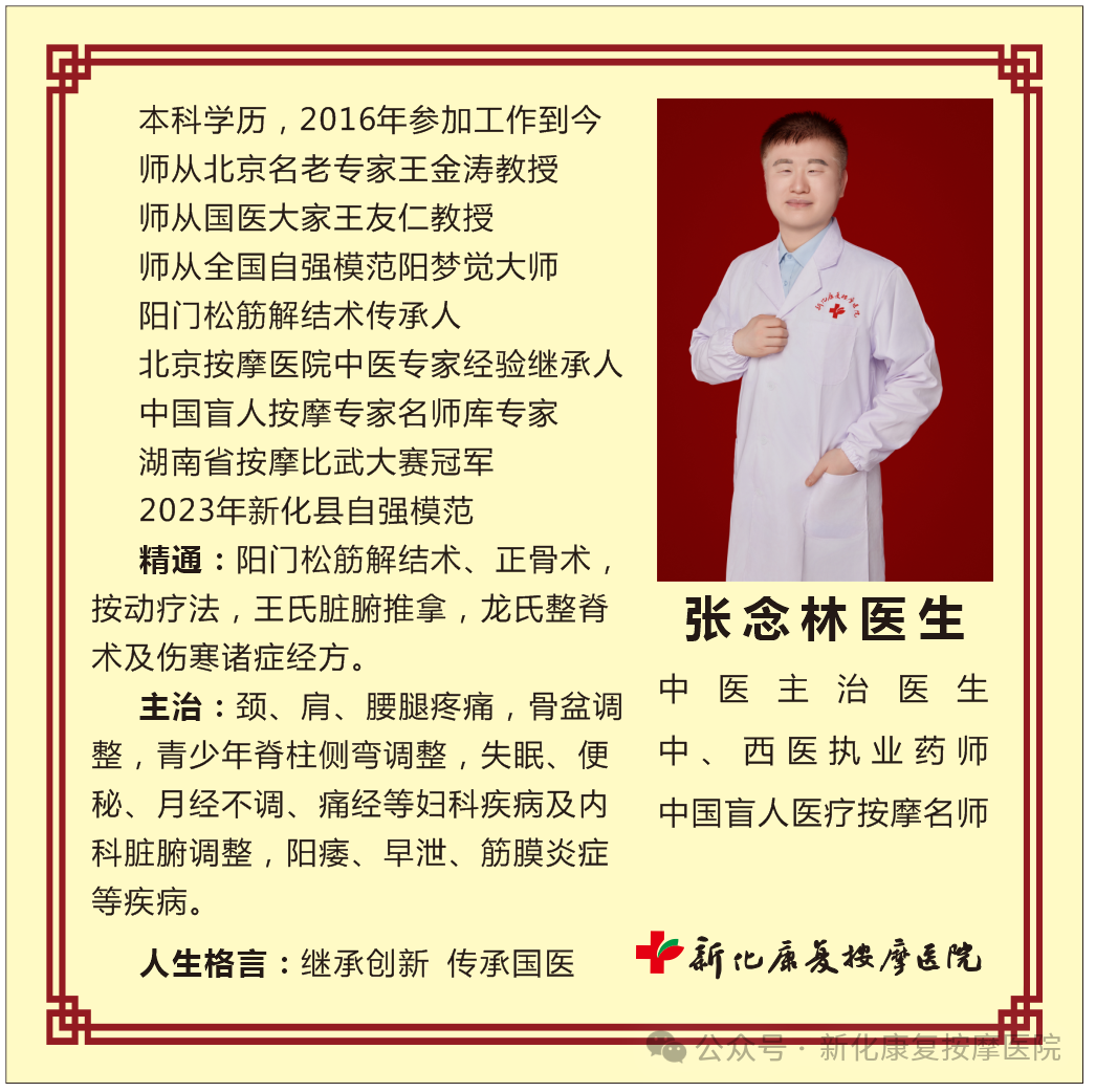 偶然相遇,安心扎根十年前,刚从长沙离职的张念林通过同学介绍,来到新化康复按摩医院。“当时晏姐、南哥对我们这些外地医生特别照顾,从生活到工作都给了很多帮助。”张念林回忆道。正是这份家人般的关怀,让这位北方医生在新化找到了归属感。从康复科起步,他在这个平台上一步步成长,考取中医主治医师、中西医执业药师等资格,并先后师从多位国内知名专家。平台托举,静待花开“医院给了我发展的平台。”张念林说得朴实。在许多人看来,国家级专家的成长往往发生在大城市、大医院,但新化康复按摩医院用行动打破了这种固有认知。在这里,张念林得以师从北京名老专家王金涛教授、国医大家王友仁教授、全国自强模范阳梦觉大师,系统学习阳门松筋解结术、正骨术、脏腑推拿等多项技术,成为“阳门松筋解结术”传承人、北京按摩医院中医专家经验继承人。2023年,他荣获“新化县自强模范”称号,并在湖南省按摩比武大赛中夺得冠军。这些成绩背后,既有个人努力,也离不开医院的全力支持。传承是最好的回报诊室墙上,“继承创新 传承国医”是张念林的人生格言。如今,这八个字正被他身体力行。